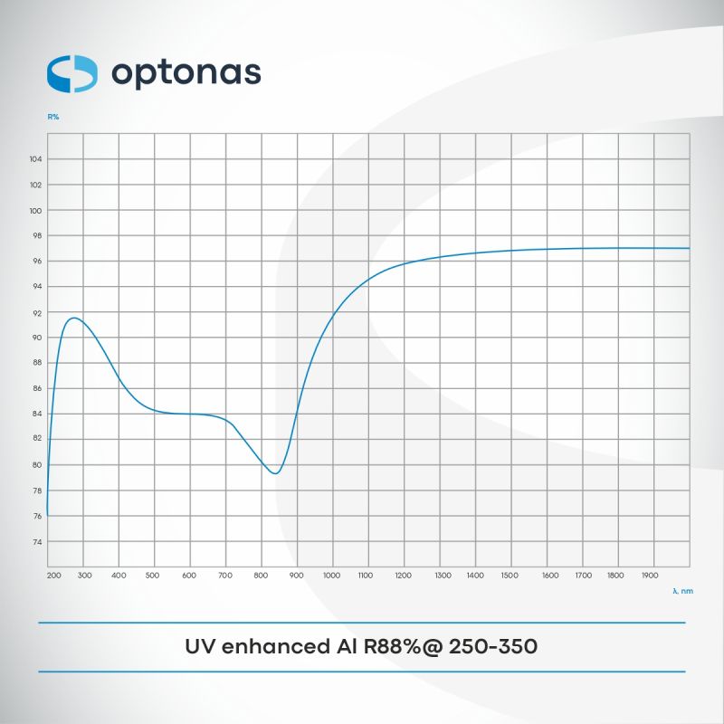 UV 맞춤형 고급 알루미늄 미러 알루미늄(Al) 코팅은 UV와 DUV 전반에 걸쳐 높은 반사율을 제공하므로 DUV, UV 레이저는 물론 UV-VIS-NIR을 모두 사용하는 광학기기에 적합한 성능을 제공합니다. Optonas에서는 까다로운 환경과 파장 범위에서의 사용을 위해 다용도 알루미늄 코팅 미러를 제공합니다. 표준 알루미늄 미러 (R>86%@300nm - IR)