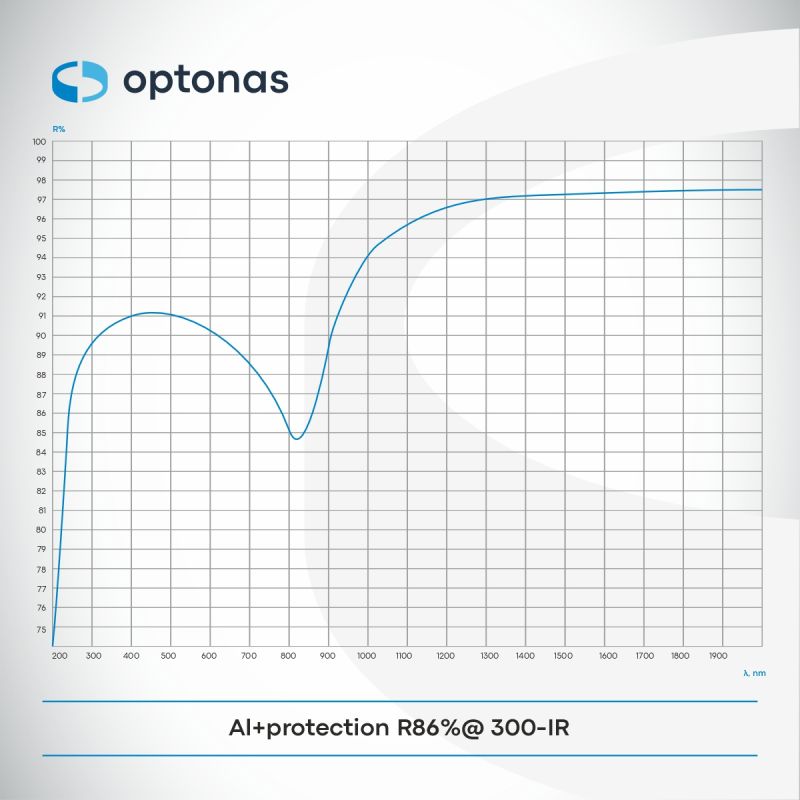 UV 맞춤형 고급 알루미늄 미러 알루미늄(Al) 코팅은 UV와 DUV 전반에 걸쳐 높은 반사율을 제공하므로 DUV, UV 레이저는 물론 UV-VIS-NIR을 모두 사용하는 광학기기에 적합한 성능을 제공합니다. Optonas에서는 까다로운 환경과 파장 범위에서의 사용을 위해 다용도 알루미늄 코팅 미러를 제공합니다. 표준 알루미늄 미러 (R>86%@300nm - IR)